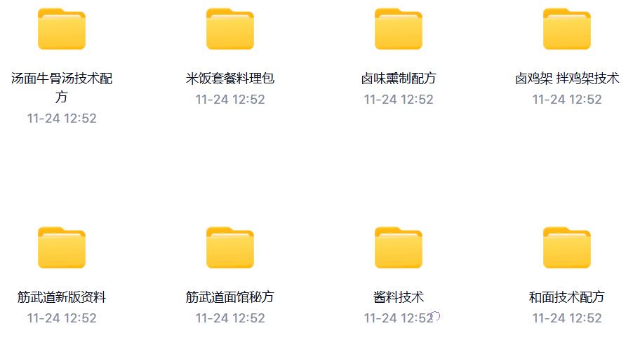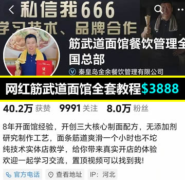 网红【筋武道面馆餐饮管理全国总部】全套教程 包括如下面食: 原汁牛肉面 朝鲜冷面 地狱牛头面 帝王蟹柳拌面 番茄龙利鱼面 番茄牛腩面 好吃担担面 老北京炸酱面 凉拌米线 麻酱鸡丝拌面 麻辣牛肉酱拌面 牛肉炸酱面 肉酱汤面 双椒炒鸡拌面 水城羊肉粉 酸菜肥牛 酸菜鱼面 虾茸肉酱拌面 酱料技术: 番茄汁制作 红烧牛肉制作 筋武道肉酱面酱油汁制作 筋武道肉酱制作 菌菇酱制作 老北京酱制作 龙利鱼肉加工制作 秘制牛肉酱制作 肉沫芽菜制作 酸菜酱制作 虾茸肉酱制作 香椒油,拌鸡架专用 蟹柳汁,双椒炒鸡汁制作 羊肉粉牛肉粉制作 面馆秘方 卤鸡架拌鸡架技术 卤味熏制配方 米饭套餐料理包
