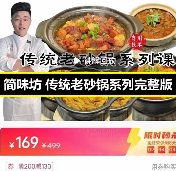 简味坊《传统老砂锅系列大课商用技术》教程包含:1.砂锅特色红烧肉 2.马蹄狮子头 3.老味椒子酱 4.青菜肉丸子 5.麻辣酱鸡爪 6.藕夹与茄盒 7.特色羊芹细 8.特色老味带鱼 9.金牌酱香猪蹄 10.川香麻婆豆腐 11海米冬瓜 12爆款鱼子鱼泡 13.砂锅特色酸汤滑肉 14.爆款灌汤素鸡 15老式咸口红烧肉 16清汤杂菌牛肉 17爆款肉沫粉丝 18经典番茄牛腩 19爆款韭菜南瓜饼
