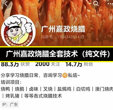 网红左师傅烧腊线下全套原版配方 教程包含:1. 传统深井烧鹅 脆皮烧鸭 脆皮烧鸡 2. 玻璃脆皮烧鹅 玻璃脆皮烧鸭 3. 玻璃乳鸽 玻璃脆皮鸡翅 芝麻脆皮鸡 4. 蜜汁叉烧 密汁排骨 密汁鸡翅 黑叉烧 5. 澳门烧肉 澳门三层肉 6. 空心烧肉 7. 吊烧金猪仔 8. 黑松露有米猪 9. 传统盐焗鸡 水焗盐焗鸡爪 鸡翅 10. 白切鸡 白切鸡卷 11. 豉油鸡 12. 潮州卤水 13. 烧腊万能汁 14. 玻璃脆皮粉